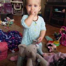 Measuring just 12 inches tall, this interactive plush is small-sized to match young children for something not too large that can be intimidating or scary. Choose from gray, gray/pink, and gray/blue color designs to match your baby’s gender.Handkerchief color is random.